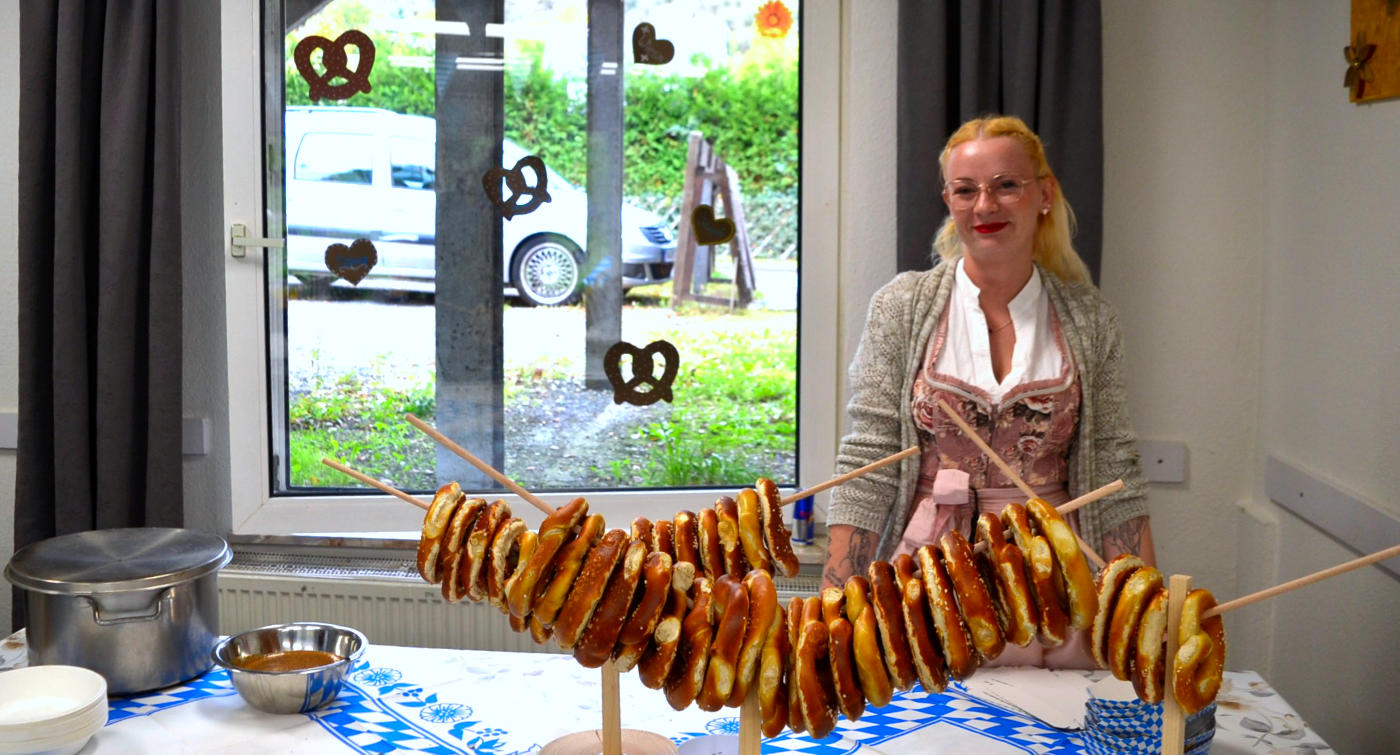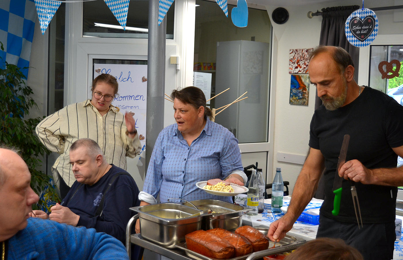 Zum Oktoberfest im Haus Bachtal in Burgbrohl hatten Orga-Team, Arbeits- und Beschäftigungstherapie, Küche, Assistenzteam und Bewohner mit dem Heimbeirat um den Vorsitzenden Torsten Gros zu Musik, Gaudi und zahlreichen Schmankerln eingeladen. Bayerische Musik klang durchs Haus und die Räumlichkeiten waren Weiß-Blau und mit weiß-blauen Fähnchen geschmückt. Andrea und Kim begrüßten die Bewohner im Namen aller Mitarbeiterinnen und Mitarbeiter und dankten den Bewohnern vom Vorbereitungsteam und der Küche, die diesen Nachmittag bayerisch-kulinarisch begleiten sollte. So gab es zum Auftakt Weißwurscht mit süßem Senf und Brezeln. Und auch Leberkas, wahlweise mit Kartoffel- oder Nudelsalat, gehört zum Oktoberfest einfach dazu wie das Amen in der Kirche.
