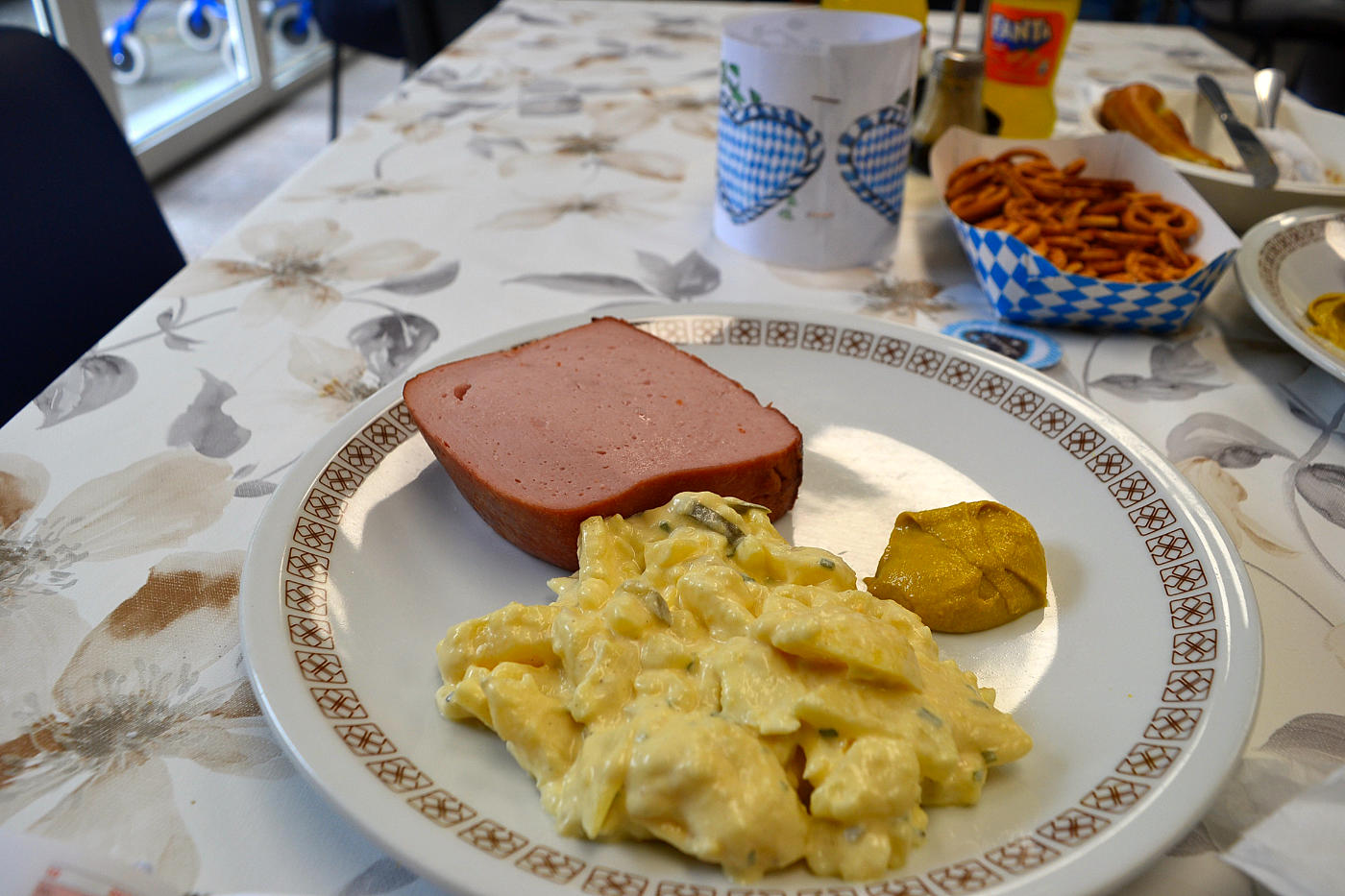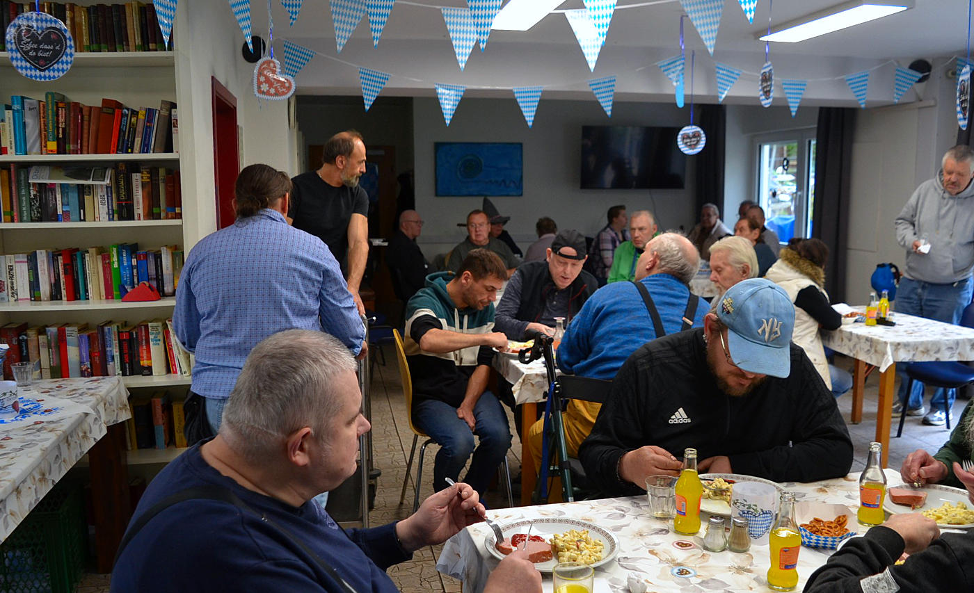 Zum Oktoberfest im Haus Bachtal in Burgbrohl hatten Orga-Team, Arbeits- und Beschäftigungstherapie, Küche, Assistenzteam und Bewohner mit dem Heimbeirat um den Vorsitzenden Torsten Gros zu Musik, Gaudi und zahlreichen Schmankerln eingeladen. Bayerische Musik klang durchs Haus und die Räumlichkeiten waren Weiß-Blau und mit weiß-blauen Fähnchen geschmückt. Andrea und Kim begrüßten die Bewohner im Namen aller Mitarbeiterinnen und Mitarbeiter und dankten den Bewohnern vom Vorbereitungsteam und der Küche, die diesen Nachmittag bayerisch-kulinarisch begleiten sollte. So gab es zum Auftakt Weißwurscht mit süßem Senf und Brezeln. Und auch Leberkas, wahlweise mit Kartoffel- oder Nudelsalat, gehört zum Oktoberfest einfach dazu wie das Amen in der Kirche.