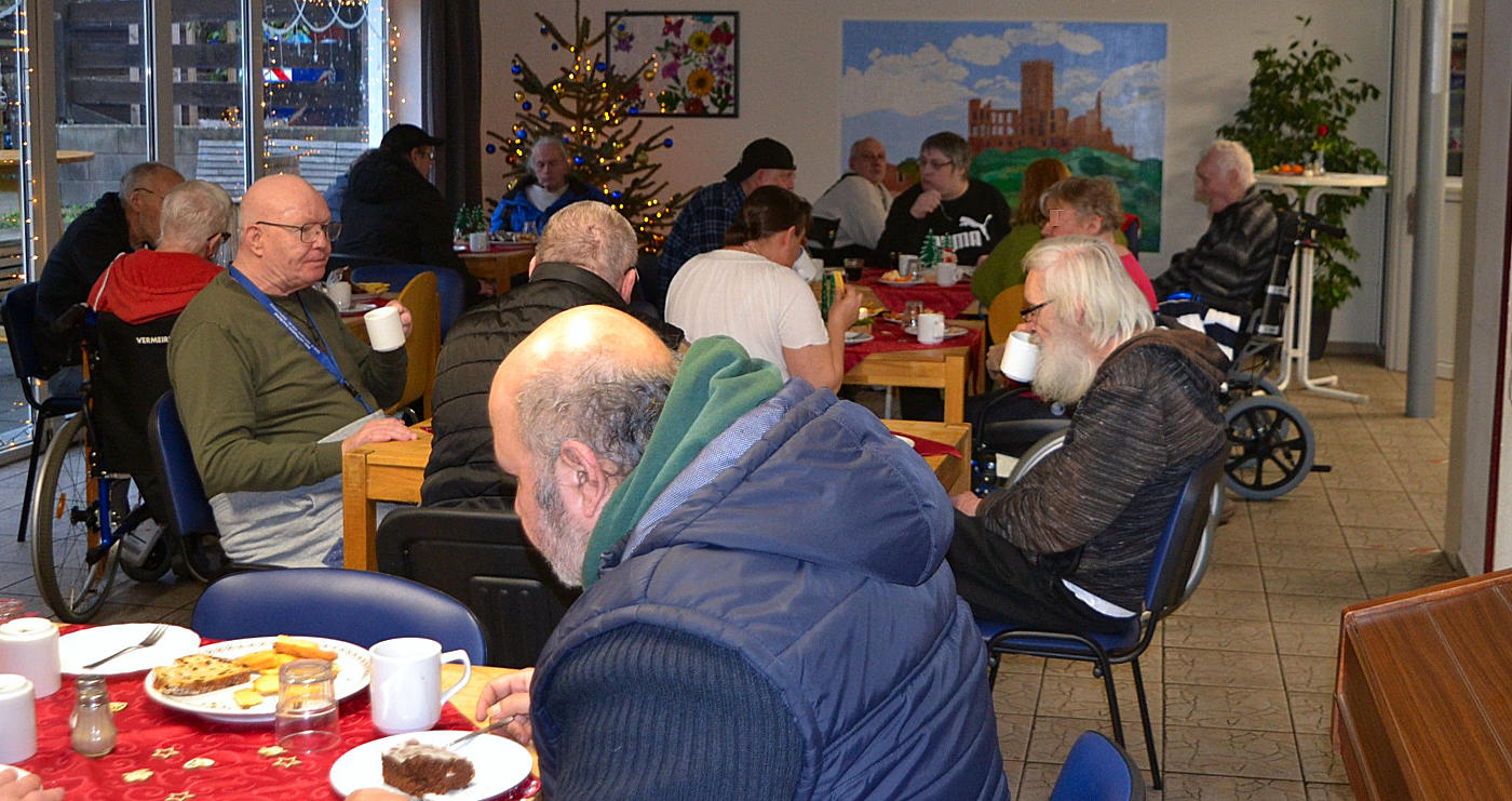 Im Haus Bachtal in Burgbrohl – Haus der Besonderen Wohnform – wurde Weihnachten gefeiert. Die von Eberhard Thomas Müller, Kirchenmusikerin Andrea Ernst und vom Flötenduo, Maria Müller und Heinz Peter Hamacher, gestaltete Andacht war auch in diesem Jahr sehr gut besucht. Heimleiter Tobias Thieringer eröffnete die Weihnachtsfeier, begrüßte die Bewohnerinnen und Bewohner und dankte den Mitarbeiterinnen und Mitarbeitern für die Vorbereitungen, so auch der Arbeits- und Beschäftigungstherapie, der Küche, dem Pflegeteam sowie dem Heimbeirat mit dem Vorsitzenden Torsten Gros. Mitarbeiterin Kim hatte auch in diesem Jahr alles festlich geschmückt, sodass der Weihnachtsbaum und darunter die von der Arbeitstherapie gebaute Krippe erstrahlten.