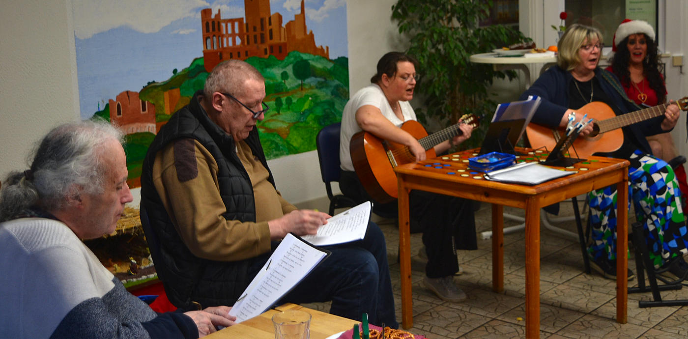 Nach dem Wortgottesdienst bot Andrea Ernst ein Weihnachtspotpourri zum Mitsingen und auch beim Wunschkonzert, von „Oh Tannenbaum“ bis „Last Christmas“, klangen die schönen Stimmen durchs Haus. Da kam Weihnachtsstimmung auf, zu der das Küchenteam Kaffee, Christstollen, Pfefferkuchen und leckere Plätzchen reichte. Für gute Unterhaltung sorgten die Bachtalsänger um Andrea und Maria an den Gitarren. Viel Freude hatten die Bewohnerinnen und Bewohner beim von Kim geleiteten Christbaumschmücken und bei dem von ihr moderierten Weihnachtsbingo, das das Warten aufs Christkind unterhaltsam verkürzte. Dann gab es die sehnlichst erwartete Bescherung mit Weihnachtsengel Vanessa Trautmann und den Mitarbeiterinnen Andrea und Yvonne, die Geschenke an die Bewohnerinnen und Bewohner verteilten.